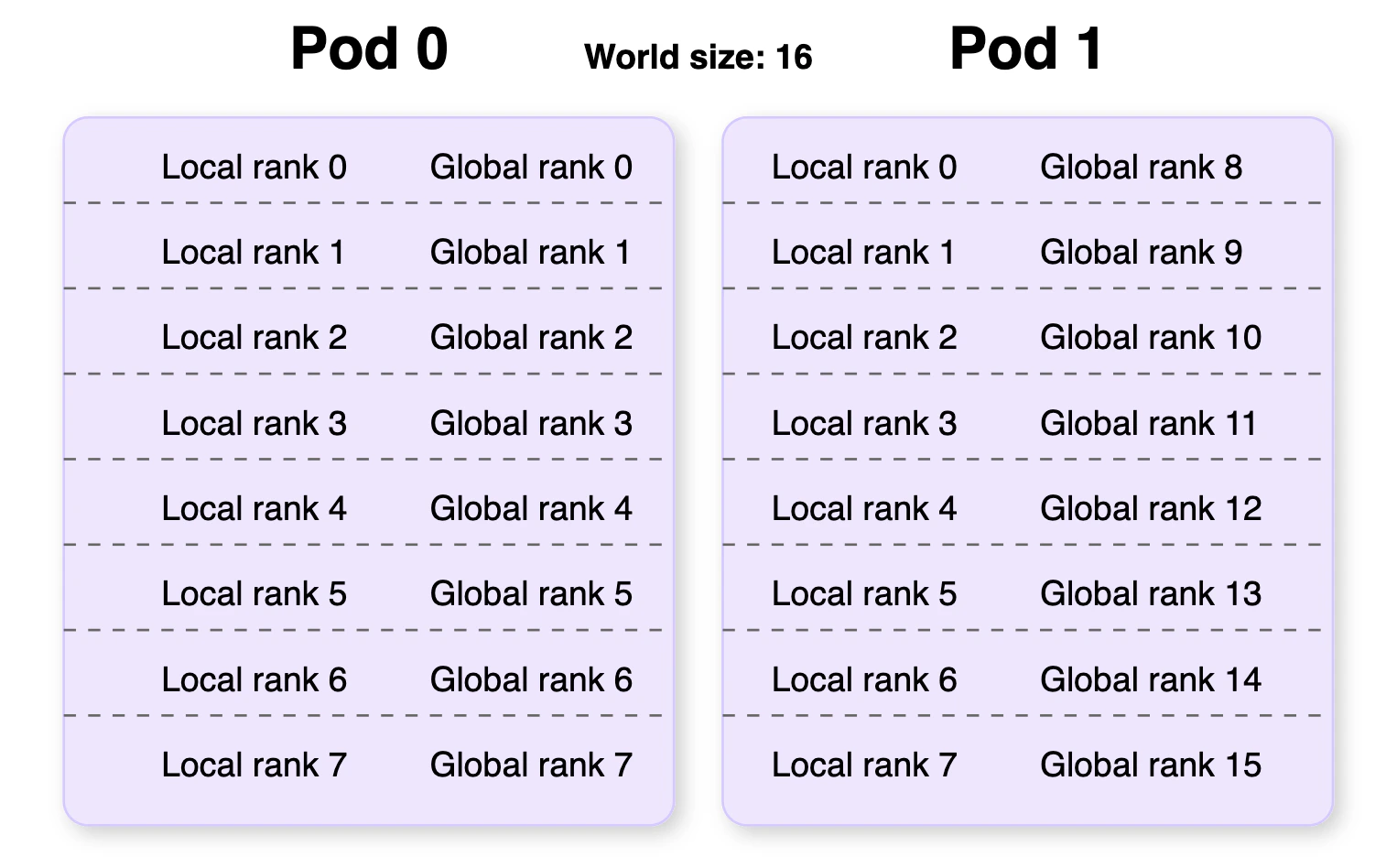 The first number refers to the global rank of the thread, spanning from 0 to WORLD_SIZE-1 (WORLD_SIZE = the total number of GPUs in the cluster). In our example there are two Pods of eight GPUs, so the global rank spans from 0-15. The second number is the local rank, which defines the order of GPUs within a single Pod (0-7 for this example). The specific number and order of ranks may be different in your terminal, and the global ranks listed will be different for each Pod. This diagram illustrates how local and global ranks are distributed across multiple Pods: